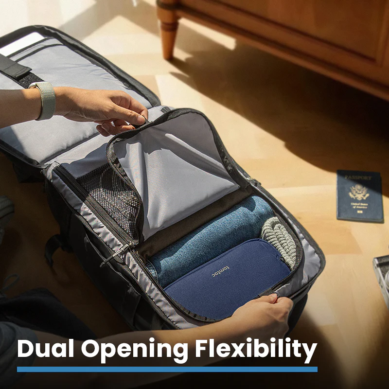 Ngăn chính được thiết kế kiểu vỏ sò, cho phép bạn đóng gói đồ đạc như một chiếc vali, dễ dàng sắp xếp quần áo và các vật dụng lớn. Ngăn đựng laptop chuyên biệt có đệm lót mềm mại, có thể chứa vừa laptop 16 inch và iPad 13 inch. Ngoài ra, các túi phụ phía trước, phía trên và hai bên hông giúp bạn dễ dàng lấy những vật dụng cần thiết như hộ chiếu, ví hay chai nước.