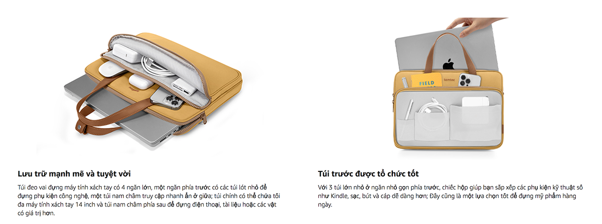 Túi chống sốc Tomtoc H22 hướng đến sự gọn gàng và tiện dụng. Không nhiều ngăn phụ cầu kỳ, nhưng đủ không gian để bạn mang theo một chiếc laptop (tối đa 14 inch), sạc, chuột và một vài phụ kiện cần thiết cho công việc hàng ngày.